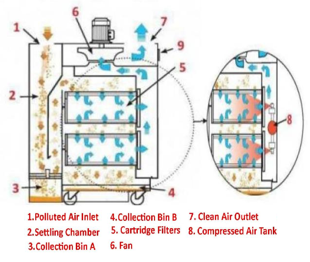 The air is pulled through the top, then through a pre-chamber equipped with a spark trap and a stainless steel collecting bin.