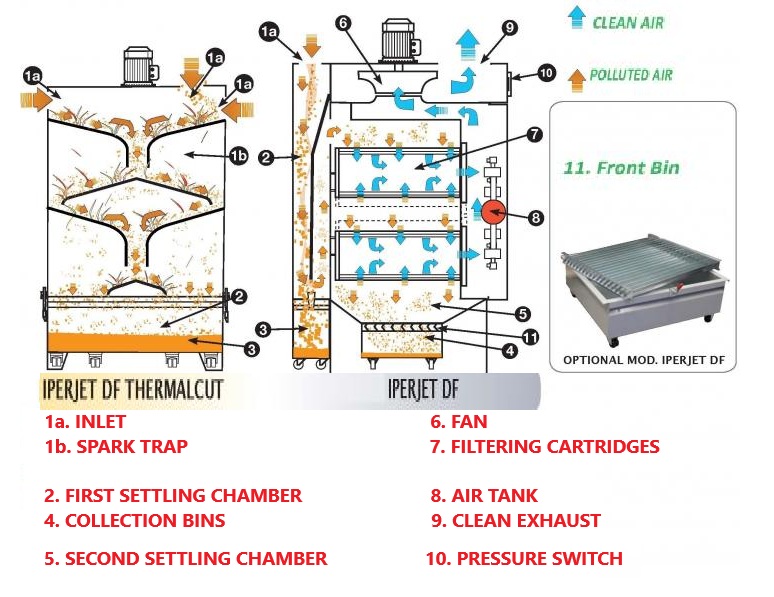 The DF is for source collection of dry powders at multiple points around a production area. It can also be used as a portable as it sits on heavy-duty locking wheels.